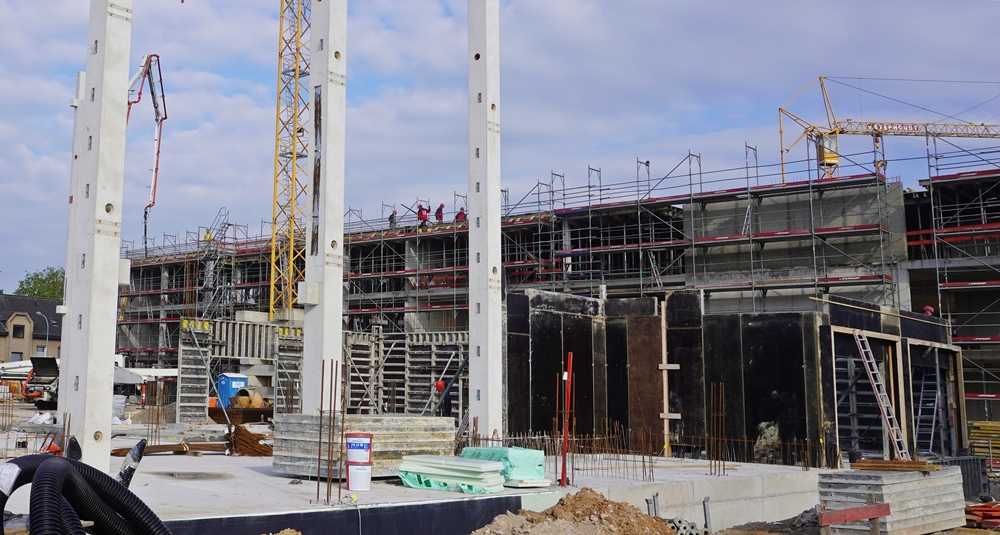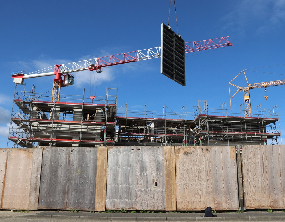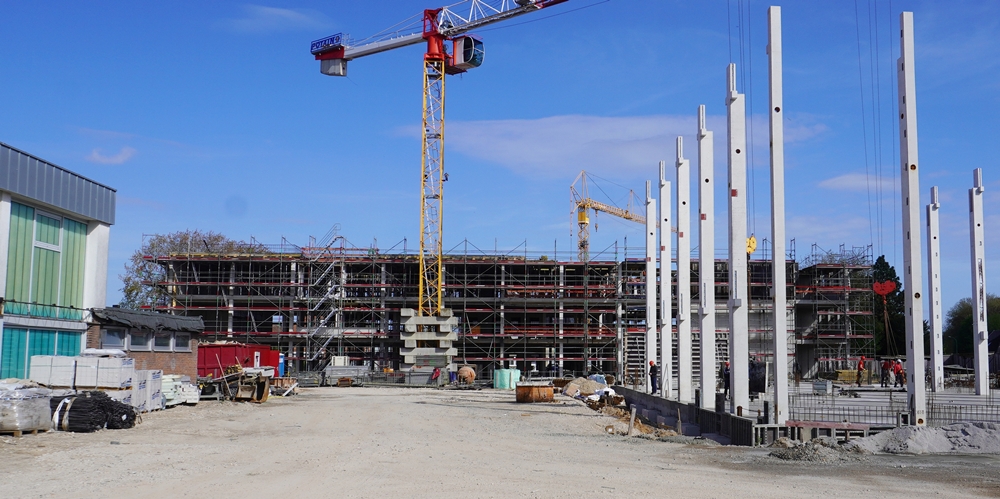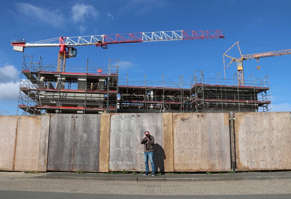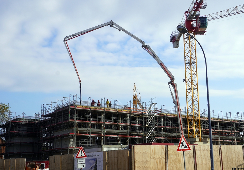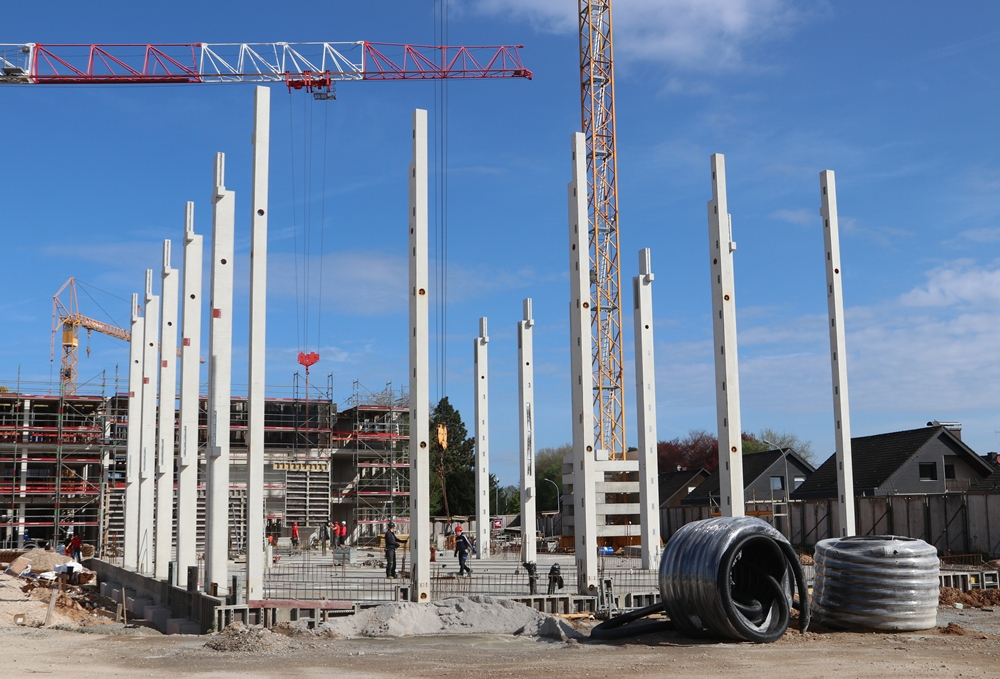 Der Fotograf und sein Model ! 😉 Der Fotograf auf der Flucht, weil eine Wandschalung über ihn schwebt.Ja ok, es war noch hinter der Holzwand. 😉 Ein Panorama Bild der neuen Grundschule in Weeze - April 2026 Die Mensa hat nun einen Betonboden gekommen Die ersten Wandschalungen des Gebäudes stehen schon !